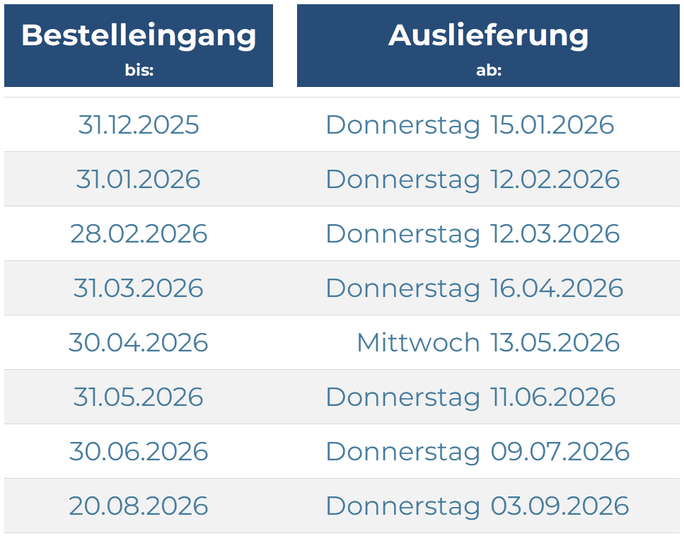 👉 Die Liefertermine richten sich nach dem Bestelleingang.